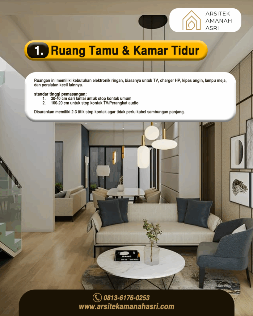 Ruang tamu dan kamar tidur biasanya memiliki kebutuhan elektronik ringan, seperti TV, charger HP, kipas angin, lampu meja, dan perangkat audio.