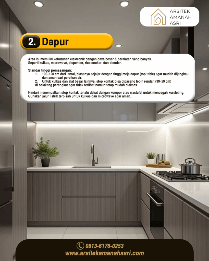Oleh karena itu, desain instalasi listrik harus mempertimbangkan keamanan dan jarak dari sumber air serta kompor.
