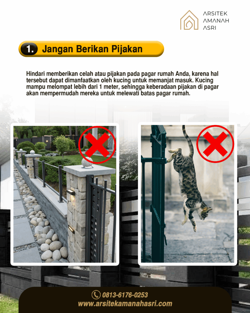 Kucing memiliki kemampuan melompat hingga lebih dari 1 meter, sehingga keberadaan pijakan pada pagar rumah dapat dimanfaatkan mereka untuk naik dan memasuki area rumah dengan mudah.