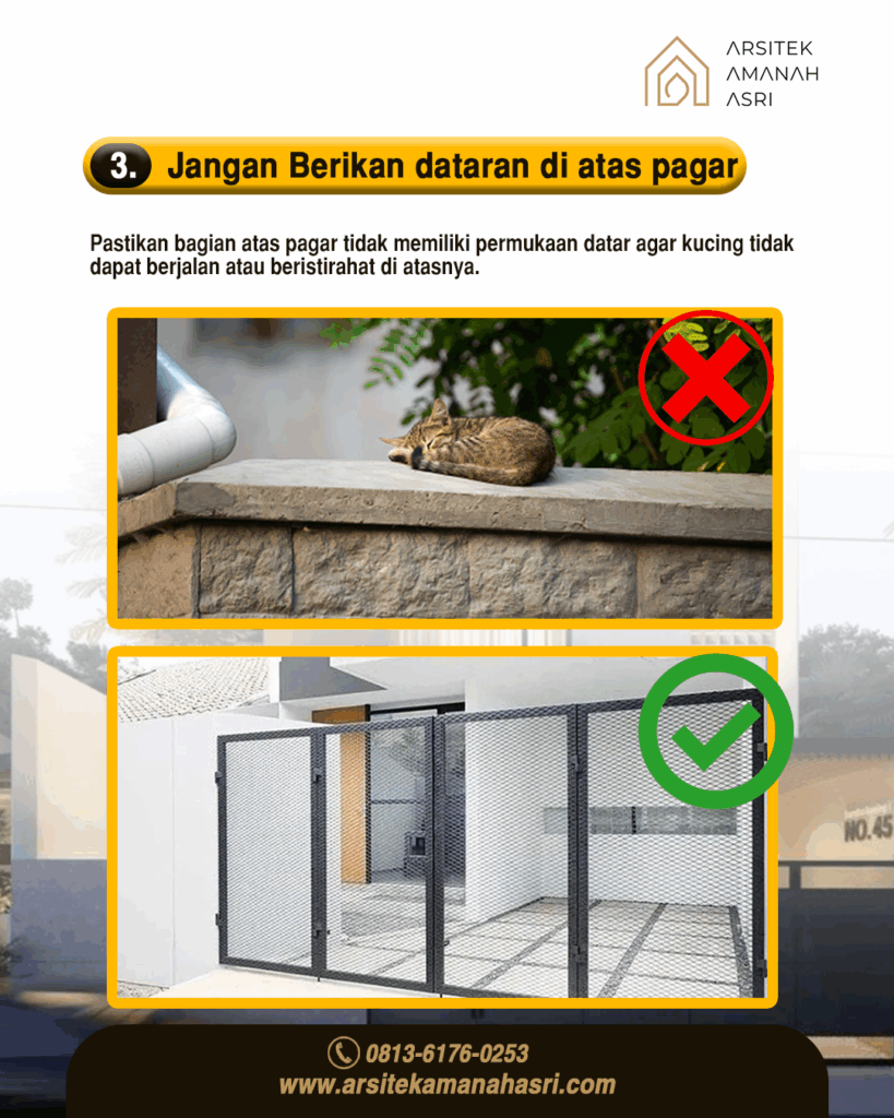 Pastikan bagian atas pagar dibuat dengan bentuk sedikit miring atau tidak datar, sehingga kucing tidak dapat berdiri atau berbaring di atasnya.
